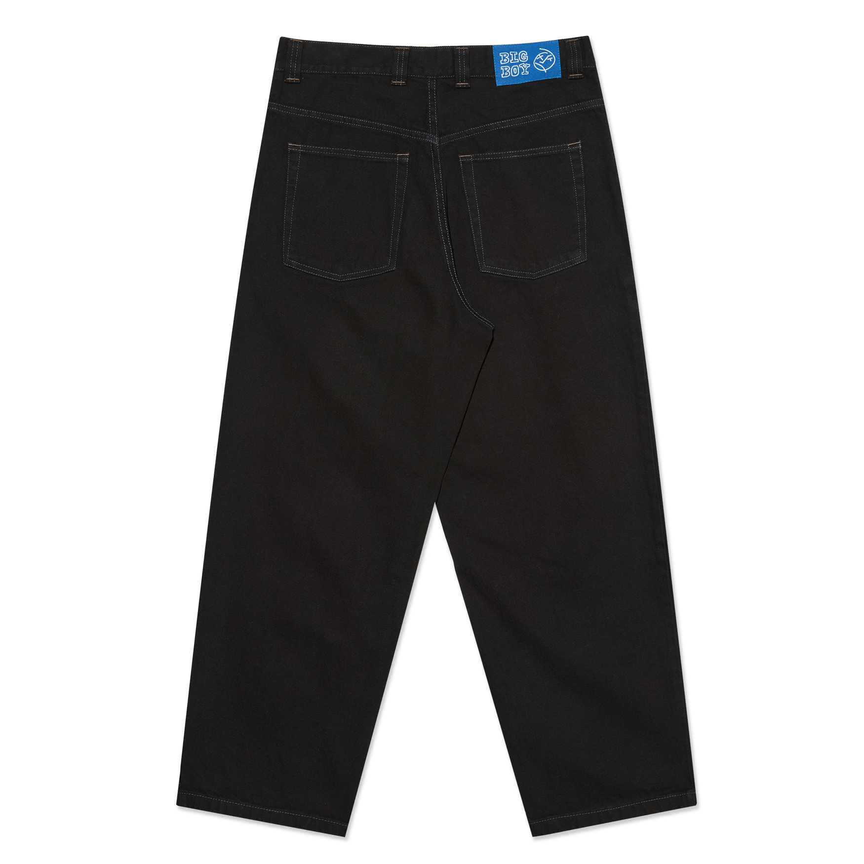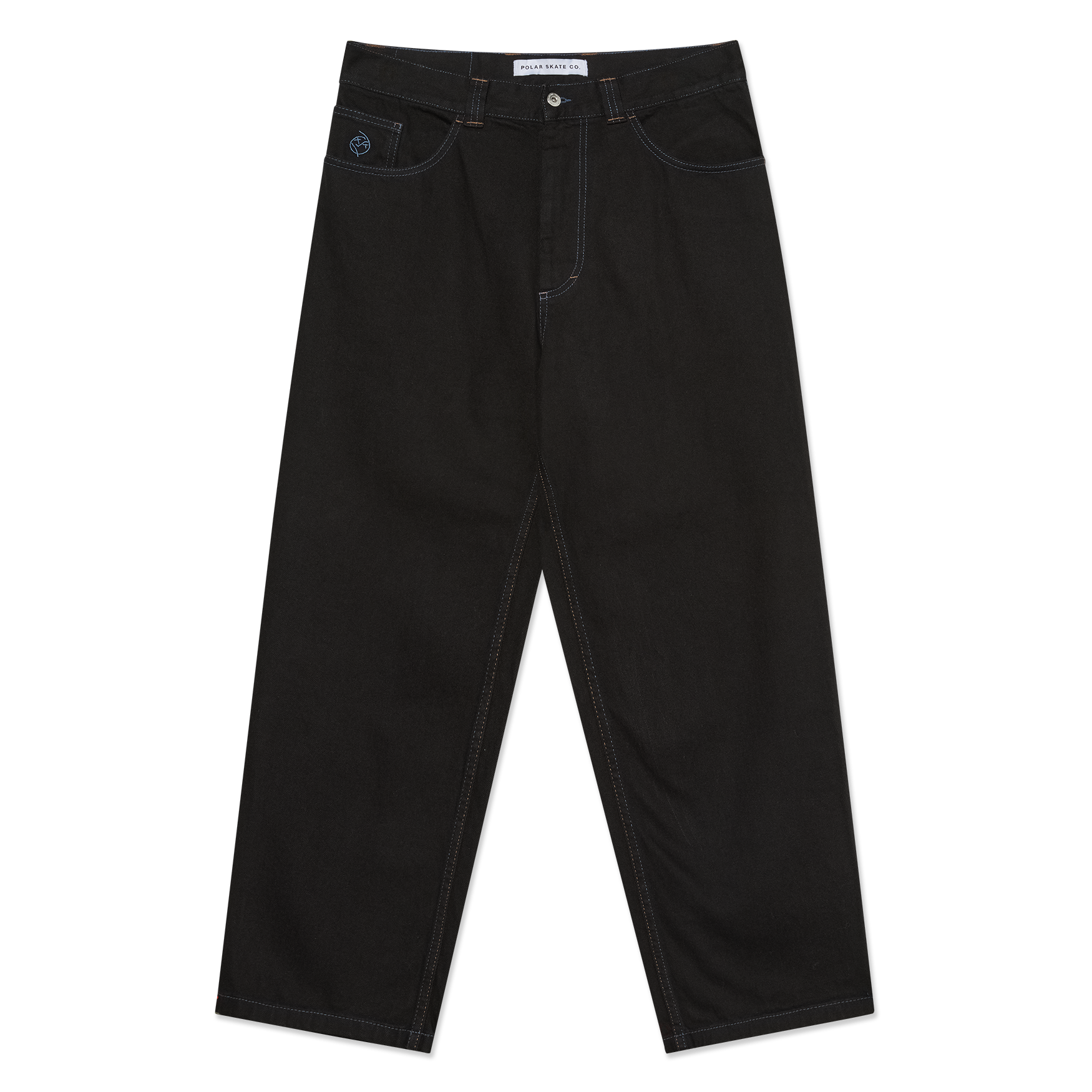 Polar Skate Co Big Boy pant black blue. 100% cotton, 435gsm, denim fabric, YKK zipper with custom button, contrast stitching, embroidery and woven label. Low waist, dropped crotch, tapered leg, oversized fit. Made in Poland.